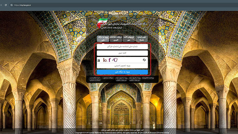 به سایت درگاه ملی خدمات مالیاتی (سامانه مودیان مالیاتی) مراجعه کرده و شماره ملی/ شناسه ملی و رمز عبور خودتان را در قسمت مربوطه مطابق تصویر زیر وارد کنید.